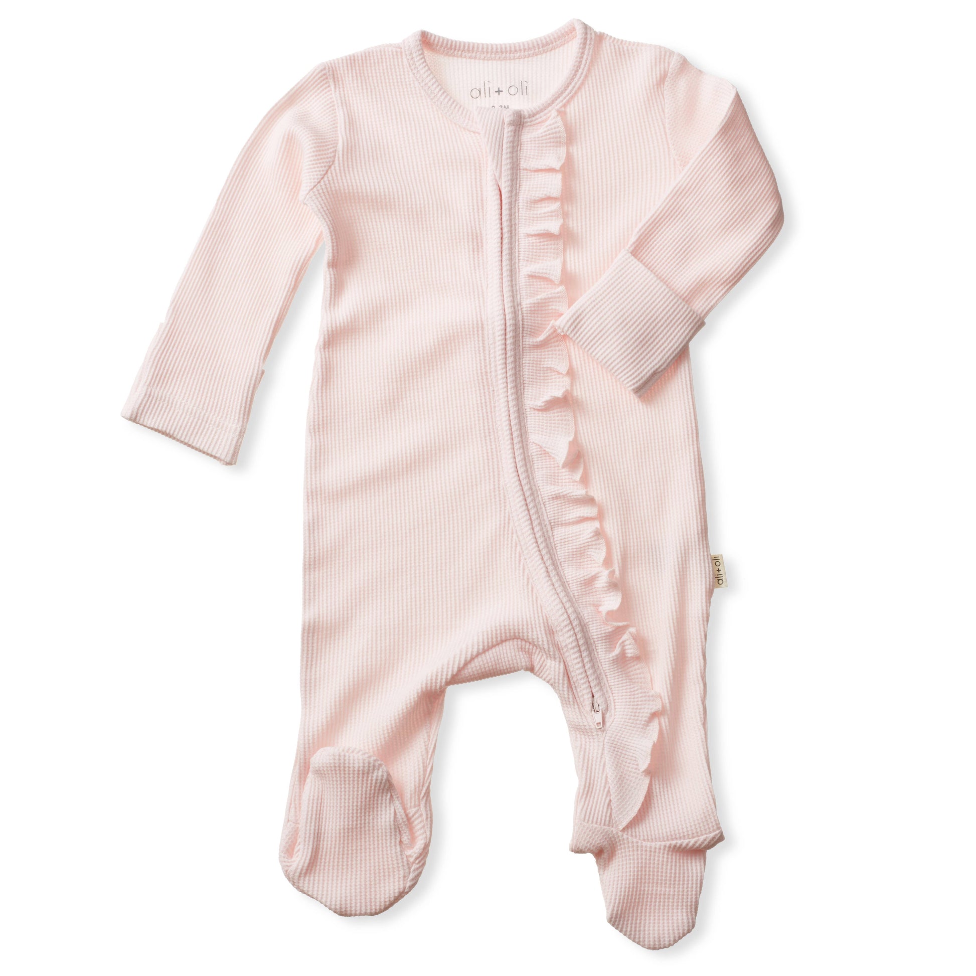 Our 100% Organic Cotton Waffle 2-Way Zip Ruffle Footie in Blush features a soft two-way zipper with a covered interior and exterior, plus a neck protector to prevent irritation. The tagless design has size info stamped onto the fabric for added comfort. Made with Oeko-Tex-certified, azo-free dyes, this breathable footie includes fold-over mittens for scratch prevention, making it ideal for daytime wear.