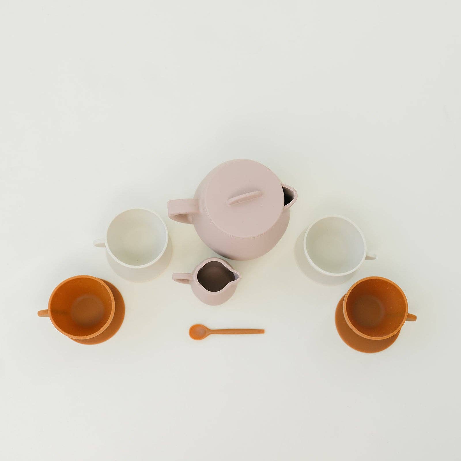 This 12 piece tea set is thoughtfully designed and available in classic neutral colors and are perfect for the modern family. They are perfect for tea parties, picnics, sensory or water play, and bath time! This set is perfect gift and is packaged in a giftable box. Features: ~ 12 piece tea set ~ 100% food grade silicone ~ BPA Free, PVC free, Phthalate free, Lead free ~ CPSC tested to ensure compliance and safety ~ Dishwasher safe ~ Ages 3 Years + Our silicone tea sets will not crack or break over time like plastic and feature a tea pot and lid, four tea cups, four saucers, one cream pitcher, and one spoon. Care Instructions: Hand wash or place in the top rack of the dishwasher. Air dry or wipe with a clean cloth to remove any water drops. Adult supervision is recommended.
