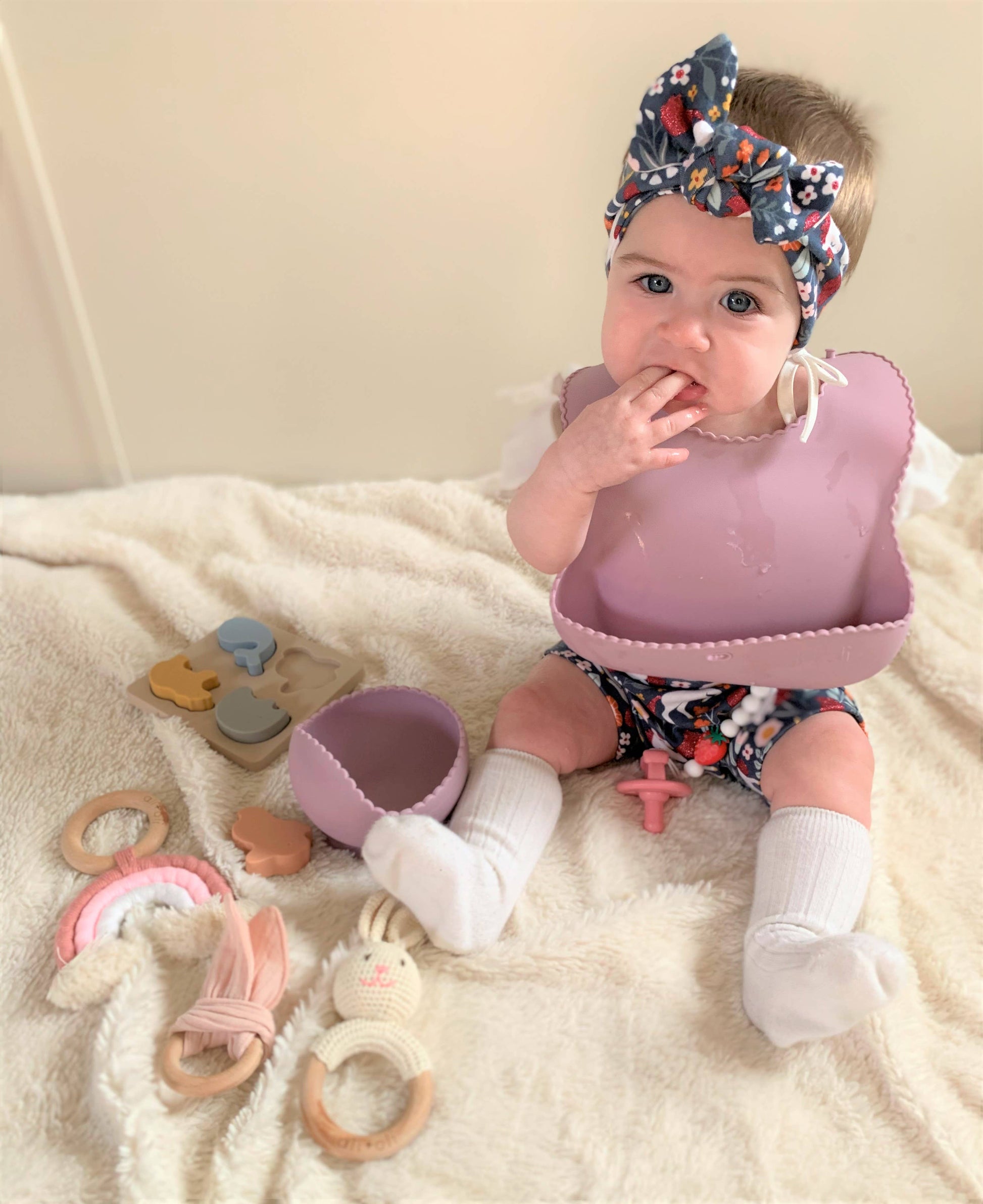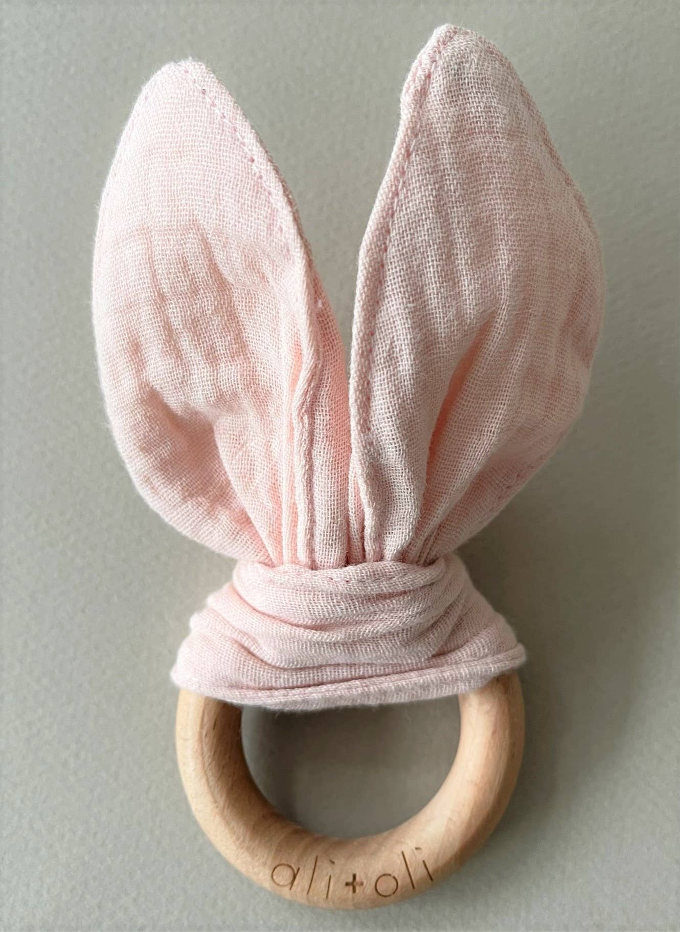 Easy-to-grasp and made with all-natural untreated 100% FSC certified beechwood and soft muslin cotton. Soft Muslin-Cotton Bunny Ears that crinkle when touched. Easy to grasp beechwood ring encourages sensory development for infants. Can be easily attached to pacifier clips Wipe clean only Handmade Size: wooden ring 2" bunny ears 3"