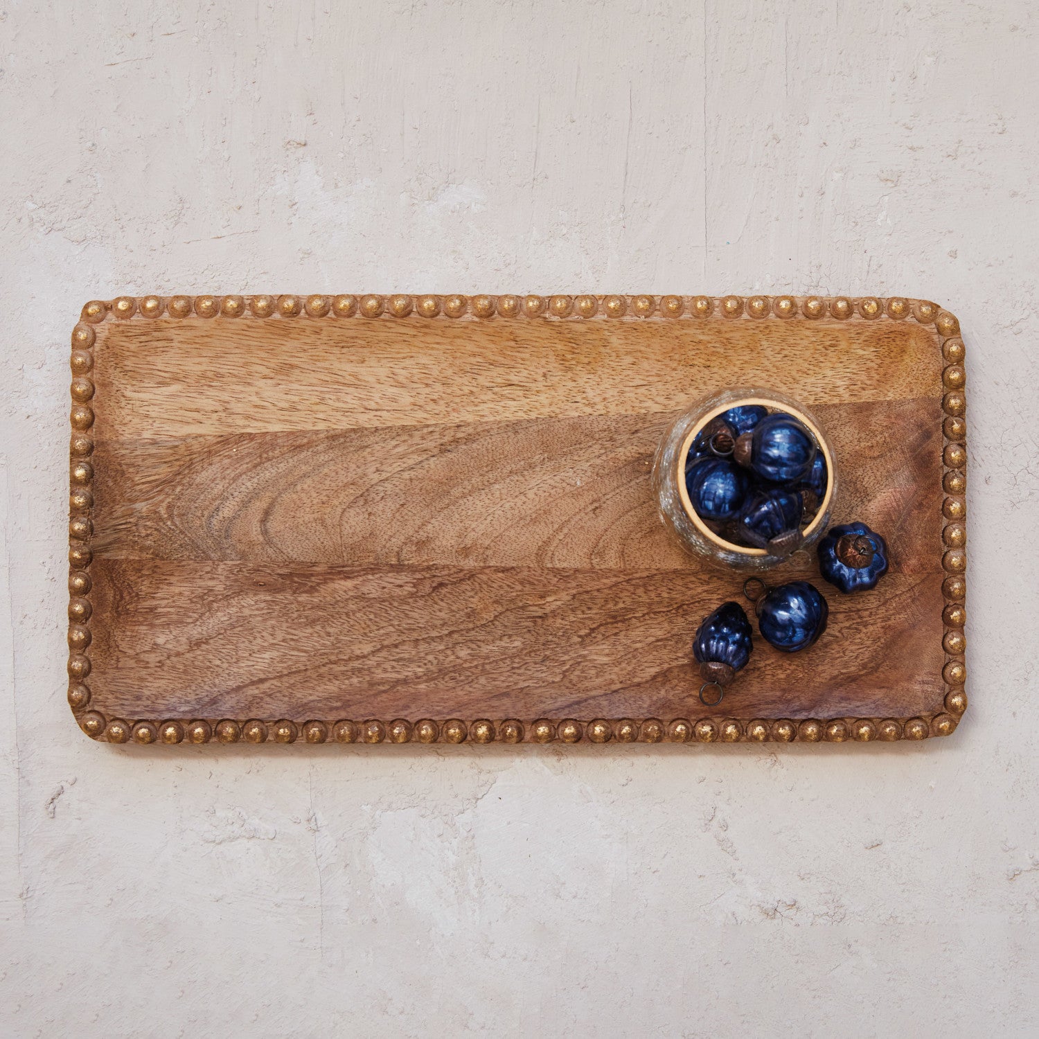 Carved Mango Wood Tray w/ Wood Beads, Natural & Gold Finish