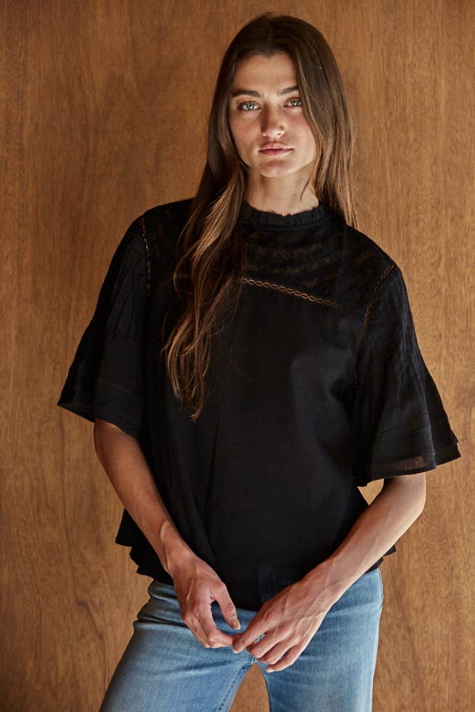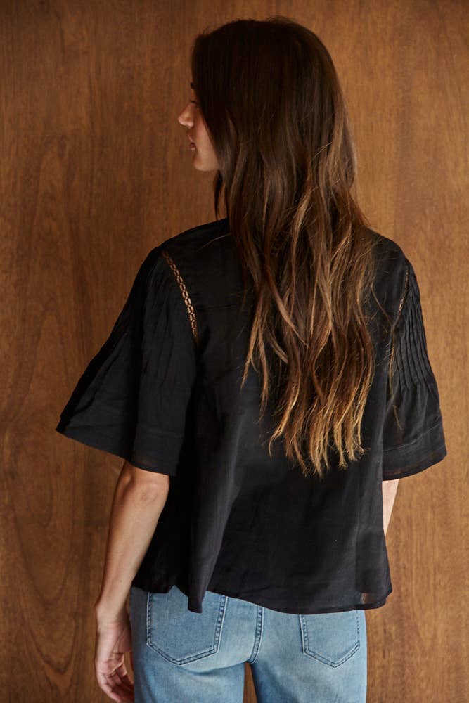 Cotton Self Fabric With Crochet Neck And Detailed Pleated Top
