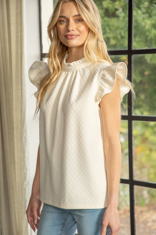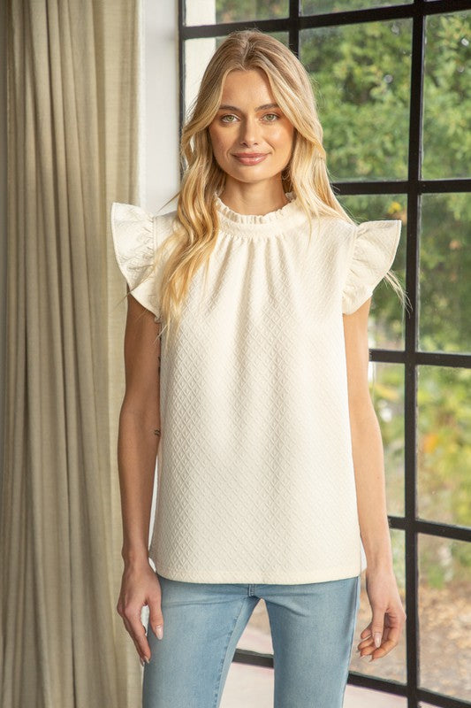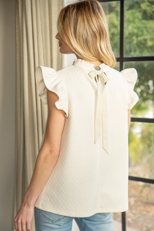 Round neckline ruffle detail - Ruffled short sleeve - Back chiffon self ribbon tie - Textured knit fabric