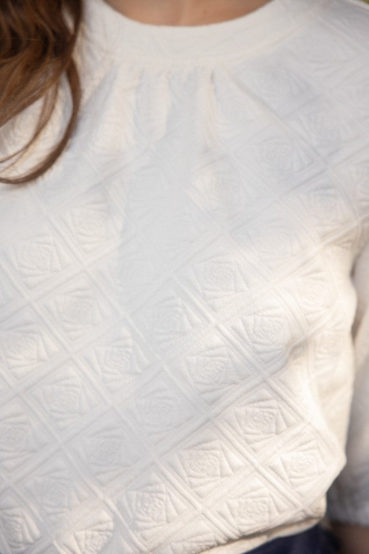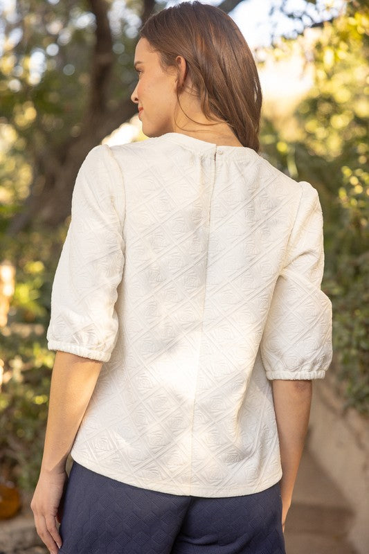 Round neckline band - Half sleeve with elastic band - Back single button closure -Textured knit fabric