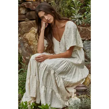 Woven Cotton Tencel Button Down Sweetheart Neck Short Sleeve Tiered Flare Maxi Dress With Waist Tie Strap And Lace Trim Detail (No Lining)